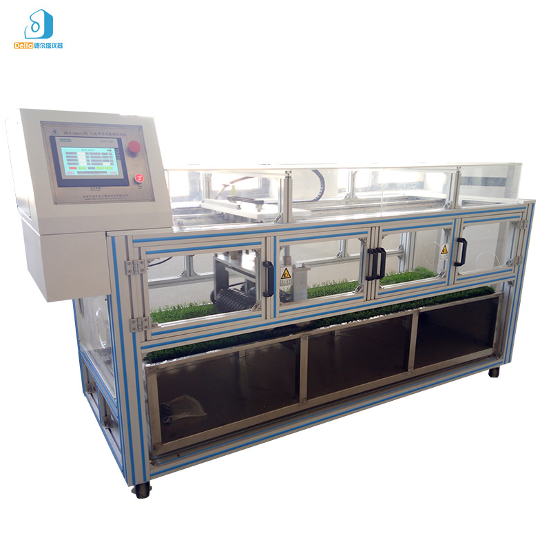 DELTA儀器公司根據FIFA和CEN的標準描述,檢測人造草坪的耐磨度, 德爾塔儀器研發了草皮磨損測試儀來進行模擬機械磨損測試.這種草皮磨損測試儀能夠進行兩種模擬測試:隨機加力磨損測試和橫向運動磨損測試,這些相關標準指定的磨損測試方式可以避免產生測試實驗的規律性。通過Lisport20耐磨損測試設備上的釘輥在人造草坪樣品上來回碾壓,模擬正常使用時,運動員穿著帶釘運動鞋在草坪上運動,達到一定的時間周期后,檢驗、評價草坪的磨損情況。耐磨性能良好的人造草坪更耐用,使用壽命更長久。本試驗機結合國外先進同類設備優點并自主創新,采用橫縱兩維方向上的兩個獨立運動系統更合理地模擬人造草坪實際使用時的磨損情況,并且結構緊湊,噪音小,操作簡單,便捷美觀。