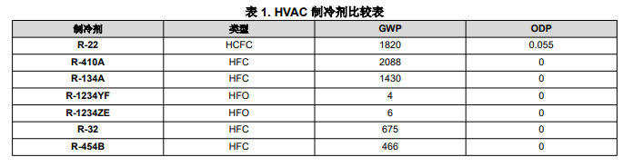 A2L 制冷劑是根據(jù) ASHRAE 安全分類命名的物質(zhì),具有輕度易燃性、低毒性和低全球升溫潛能值 (GWP)。這些制冷劑也具有零消耗臭氧潛能值 (ODP)。就這些制冷劑的化學(xué)成分而言,A2L 制冷劑是氫氟烯烴 (HFO) 或 HFO 混合物。與以前在 HVAC 系統(tǒng)中使用的 HFC 和 HCFC 制冷劑(即 R-410A 和 R-22 等)相比,A2L 制冷劑更節(jié)能,同時(shí)也更符合全球綠色能源倡議。下面的表 1 展示了一些常見(jiàn)的 HVAC 制冷劑以及相應(yīng)的 GWP/ODP 值。