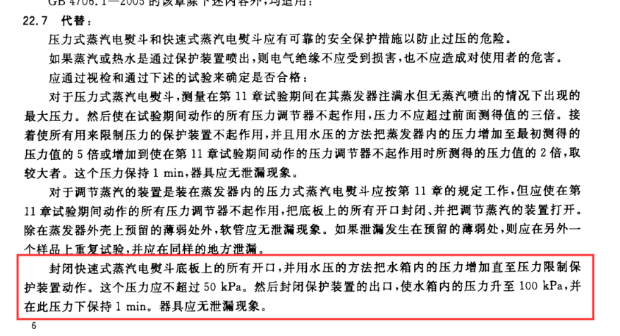 (2)對于調(diào)節(jié)蒸汽的裝置是裝在蒸發(fā)器內(nèi)的壓力式蒸汽電熨斗應(yīng)按第n 章的規(guī)定工作,但應(yīng)使在第11章試驗期間動作的所有壓力調(diào)節(jié)器不起作用,把底板上的所有開口封閉、并把調(diào)節(jié)蒸汽的裝置打開除在蒸發(fā)器外殼上預(yù)留的薄弱處外,軟管應(yīng)無泄漏現(xiàn)象如果泄漏發(fā)生在預(yù)留的薄弱處,則應(yīng)在另外一個樣品上重復(fù)試驗,并應(yīng)在同樣的地方泄漏。