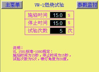 施焰次數(shù)、停止時(shí)間等相關(guān)參數(shù)根據(jù)UL1581標(biāo)準(zhǔn)之對應(yīng)模式要求,程序內(nèi)部已固定好,外部設(shè)定無效;另需注意只有在試驗(yàn)停止時(shí),模式選擇才起作用;