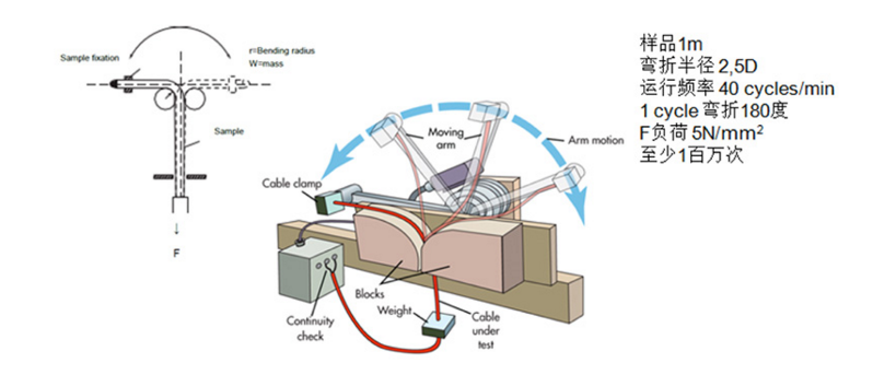 這項(xiàng)測試考核電纜在徑向承受拉力,線芯施加電壓電流負(fù)荷的情況下,整體的柔韌性表現(xiàn)。