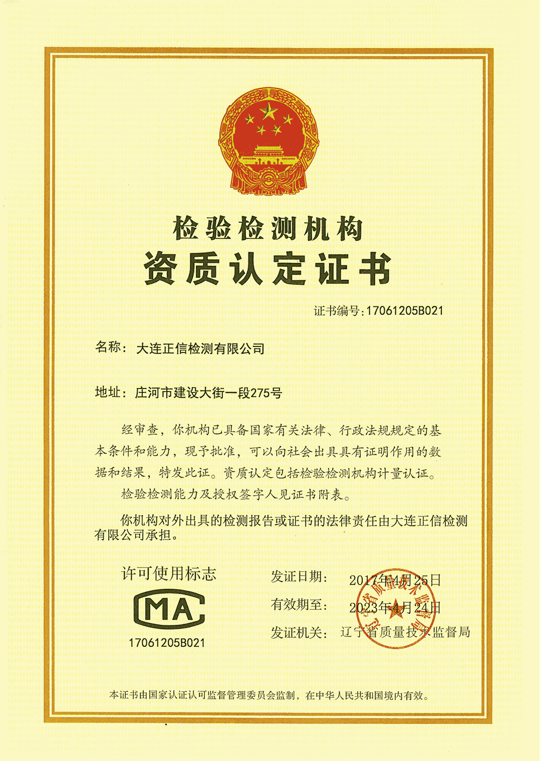 大連正信檢測有限公司(簡稱正信檢測)創立于2016 年,誕生于黃海之濱,植根綠水青山,守望碧水藍天,作為環境檢測監測的推進者與環境咨詢的服務者,在領跑行業行程中臻成完善的質量管理體系,取得國家CMA資質認證,尤在國家標準GB36246-2018發布后取得中小學合成材料面層運動場地全部54 項檢測能力認證,成為遼寧省首家取得塑膠跑道領域新國標資質認證的第三方檢驗檢測機構。
