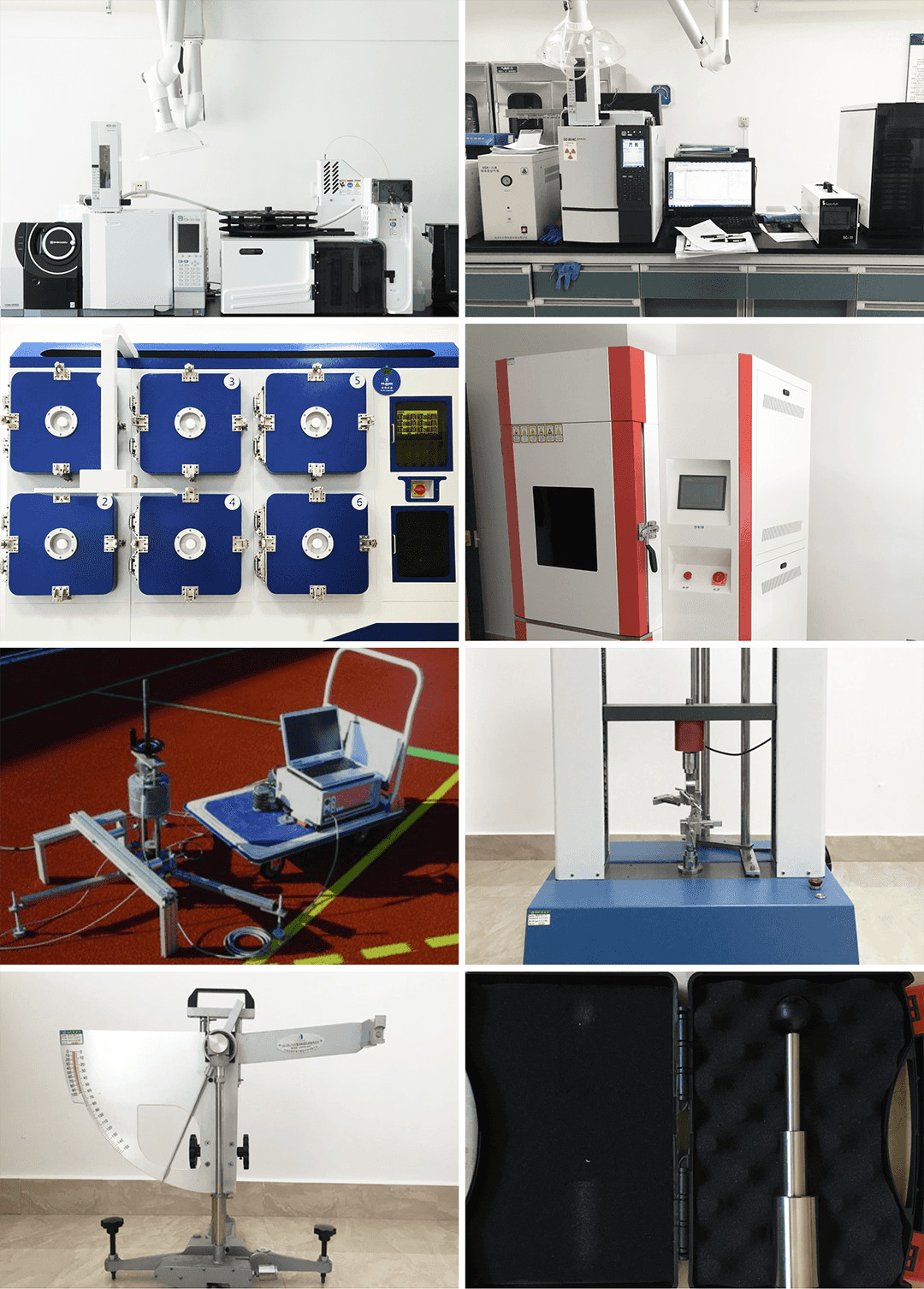 正信檢測以固定、可移動兩種方式進行檢測,建立了專業運動場地合成材料面層及原材料實驗室等。企業配備了先進的儀器設備,包括進口氣相色譜-質譜聯用儀(GC-MS)、塑膠跑道面層耐老化試驗箱、專業VOC環境測試艙、拉力試驗機、沖擊吸收檢測儀/垂直變形測試儀、抗滑值測定儀、塑膠跑道三針測厚儀等。