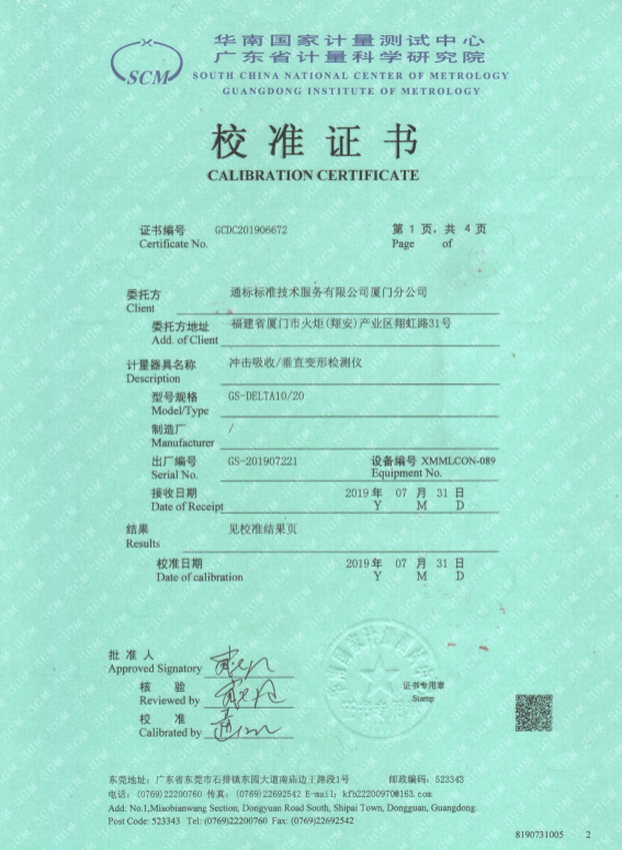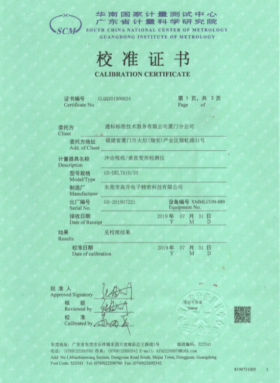 從訂單簽訂到生產、調試、計量校準、培訓售后,Delta德爾塔儀器自上到下高度重視,快速高效的完成了客戶的委托,并成功在華南國家計量測試中心取得了該中心首份“沖擊吸收與垂直變形檢測儀”合格計量證書,獲得了SGS廈門實驗室領導的一致好評。