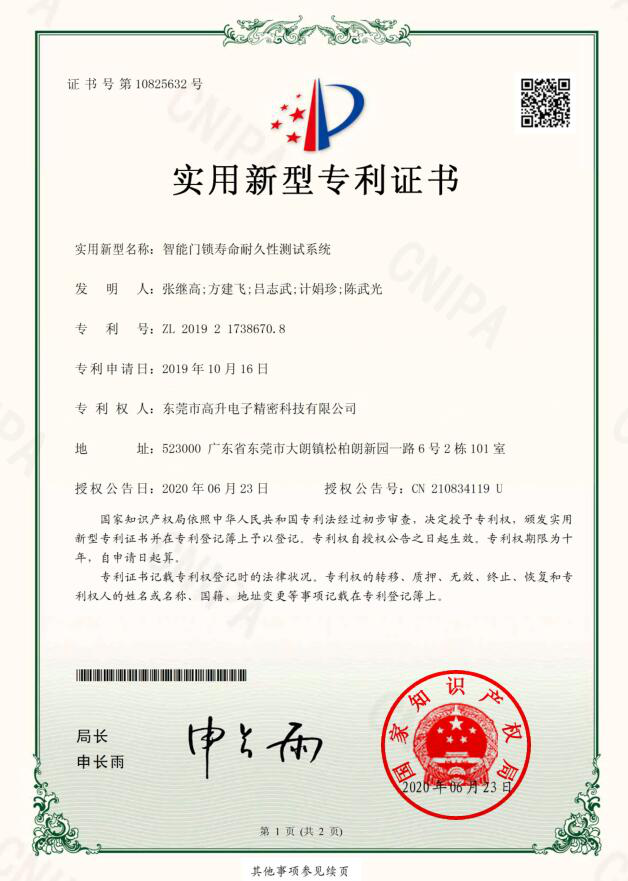 我司各種鎖具檢測設(shè)備專利證書