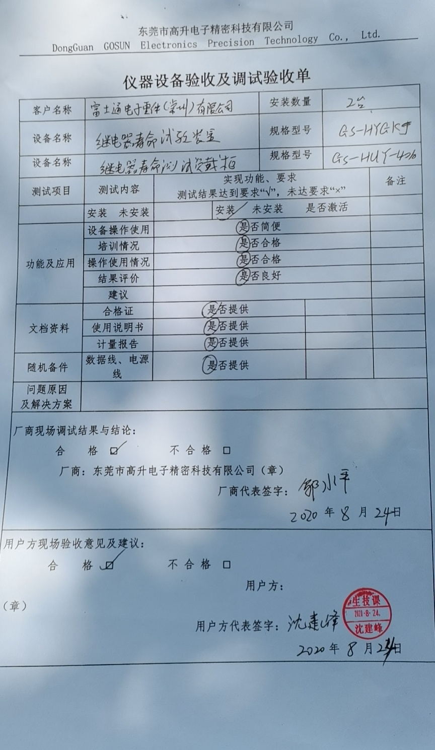 儀器設備驗收及調試驗收單