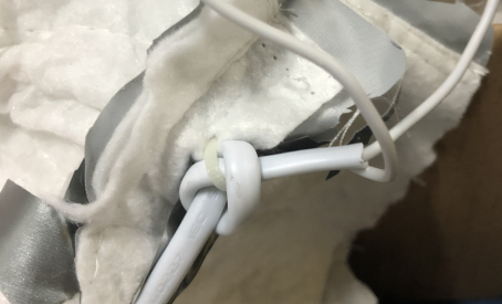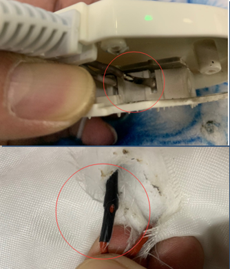 電熱毯中的發熱線和內部線在進行25000周期的彎曲試驗中,未達到彎曲次數,內部發熱線已經斷裂,不符合標準GB 47-6.1-2005和GB 4706.8-2008第21.111.1條款“樣品不能損壞”的要求。