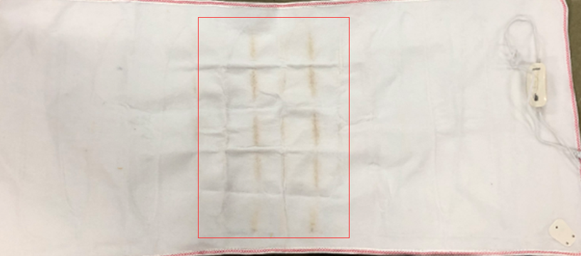 電熱毯進行折疊后的發熱試驗時,測得發熱元件表面溫升為151.2K(限值:≤145K)毯體表面熔損和焦化,不符合GB 4706.1-2005和GB 4706.8-2008標準第19.106條款的要求。