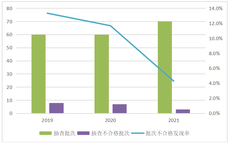 本次抽查了6個(gè)省(市)60家企業(yè)生產(chǎn)的70批次產(chǎn)品,其中3批次產(chǎn)品不合格,不合格發(fā)現(xiàn)率為4.3%。