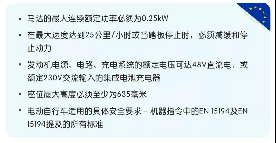 此外,電池必須符合機(jī)械自行車標(biāo)準(zhǔn),并通過電氣安全和電磁兼容性(EMC)測(cè)試;電池充電器必須符合適用的標(biāo)準(zhǔn),最大功率,踏板輔助功能是必須要測(cè)試的項(xiàng)目,以確保在騎手停止向前踏板或達(dá)到最大速度時(shí)切斷電源;必須進(jìn)行IPX測(cè)試,以確保在潮濕情況下的安全性;并且必須滿足特定的標(biāo)記、標(biāo)簽和文件的要求。