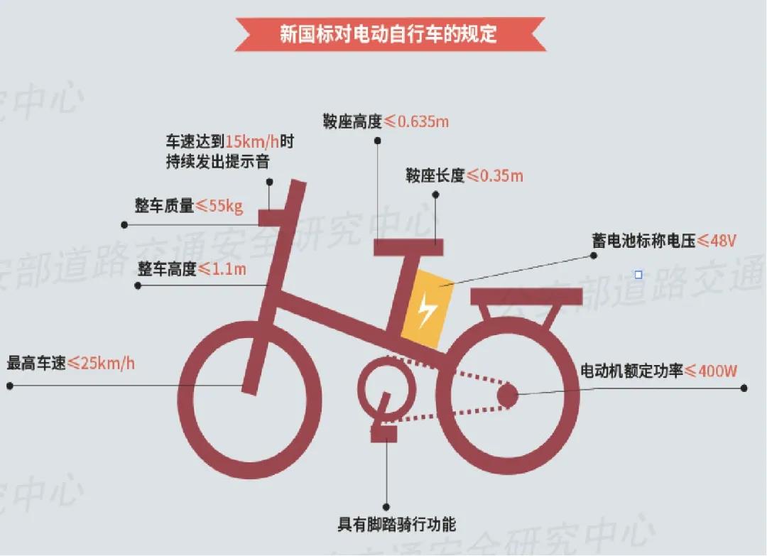 電動自行車現行國家強制性標準為GB 17761-2018《電動自行車安全技術規范》,于2019年4月15日正式實施,新標準從整車安全、機械安全、電氣安全、防火性能、阻燃性能、無線電騷擾特性和使用說明書這7個方面出發,對“整車標志、車速限值、制動性能、整車質量、腳踏騎行能力、尺寸限值、結構、車速提示音、淋水涉水性能、車架/前叉組合件、把立管和鞍管、反射器、照明和鳴號裝置、電氣裝置、控制系統、充電器與蓄電池、防火性能、阻燃性能、無線電騷擾特性、使用說明書”這20項做出了規定。相較于舊版標準,新標準規定了電動自行車最高行駛速度不得超過25km/h,整車質量不大于55kg,蓄電池標稱電壓不大于48V,電機功率不大于400W,鞍座長度不大于350mm,行駛車速達到15km/h時應持續發出提示音,充電線路和電池輸出端應裝有短路保護裝置,主要線路和裝置的材料應具有防火性能等諸多保障消費者行駛安全和使用安全的關鍵指標。新標準的制定,對電動自行車的定義也更加明確,即“自行車”、屬于非機動車類別。