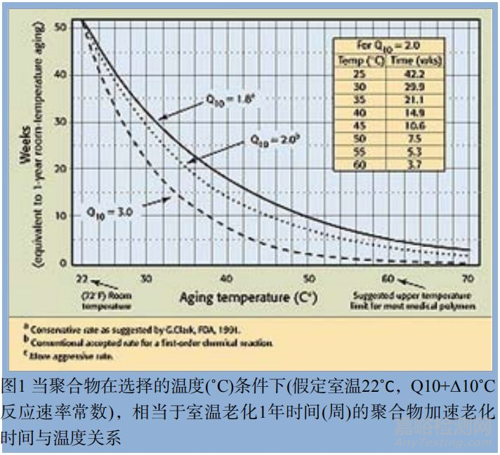 一個給定的聚合物具有以各種方式 ( 晶體、玻璃、不定形等 ) 組成的許多化學功能基團,并含有添加劑如抗氧化劑、無機充填劑、色素和加工助劑。所有這些變量的總和結合產品使用和儲存條件變量決定了材料的化學性能的退行性變。值得慶幸的是,生產醫(yī)療器械的大部分都是采用常用的幾種高分子材料,這些材料已經廣泛使用并且都進行了良好的表征。根據以碰撞理論為基礎的阿列紐斯(Arrhenius) 模型建立的加速老化簡化實驗方案 (Simplified Protocol for AcceleratedAging),也稱“10 度原則”(10-degree rule),可在中度溫度范圍內適用于良好表征的聚合物,試驗結果可以在要求的準確度范圍內。