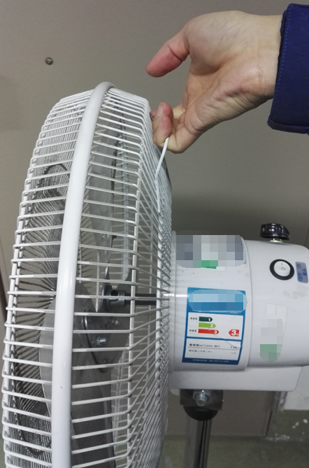 某便攜式電風扇,塑料旋鈕上有一顆接地金屬固定螺釘銷釘,人手操作時可以摸到,如圖1和圖2所示。