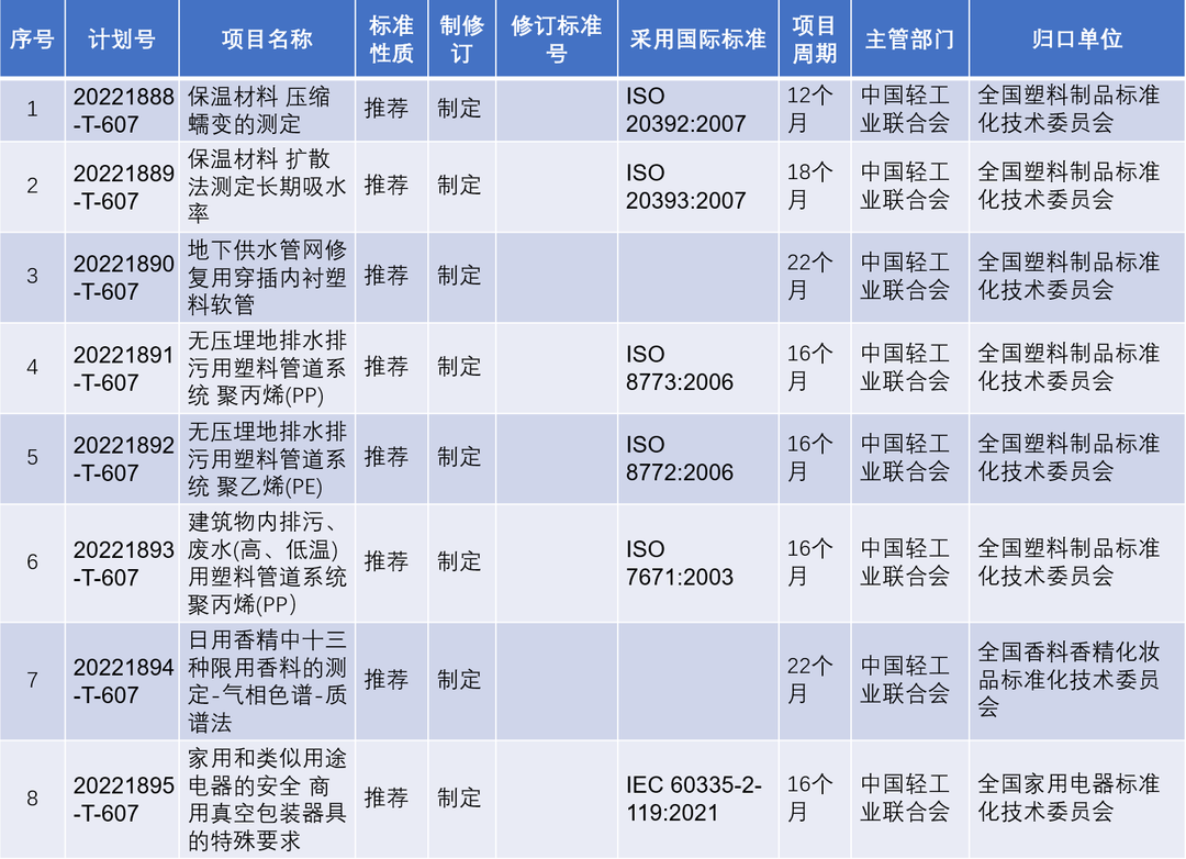 近日,國家標準化管理委員會發布關于下達2022年第四批推薦性國家標準計劃及相關標準外文版計劃的通知(國標委發【2022】51號)。本批推薦性國家標準計劃共計389項,其中包括《保溫材料 壓縮蠕變的測定》《日用香精中十三種限用香料的測定-氣相色譜-質譜法》等22項輕工領域推薦性國家標準。本批推薦性國家標準同步下達英文版計劃共計50項,其中包括《綠色產品評價 家具》輕工領域國家標準外文版,具體如下。