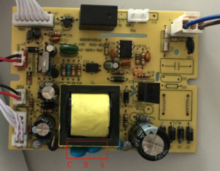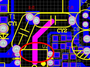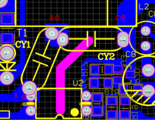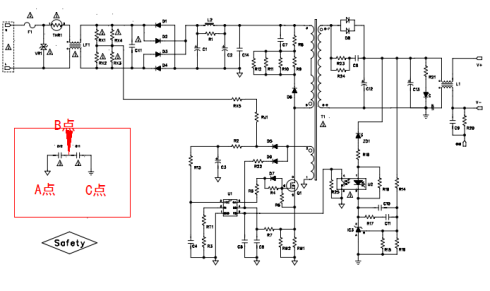 某適配器電源板中,有兩個Y2電容串聯跨接初級的地與次級的地,如圖1、圖2和圖3所示。圖中A點銅箔為初級電路地,C點為人手可以接觸到次級電路地,B點為兩個Y電容串聯連接點,AC之間電壓實測110V~,AB之間實測55V~,BC之間實測55V~。