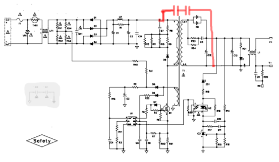圖5 2個Y2電容跨接在一次電路+310V與二次電路地之間