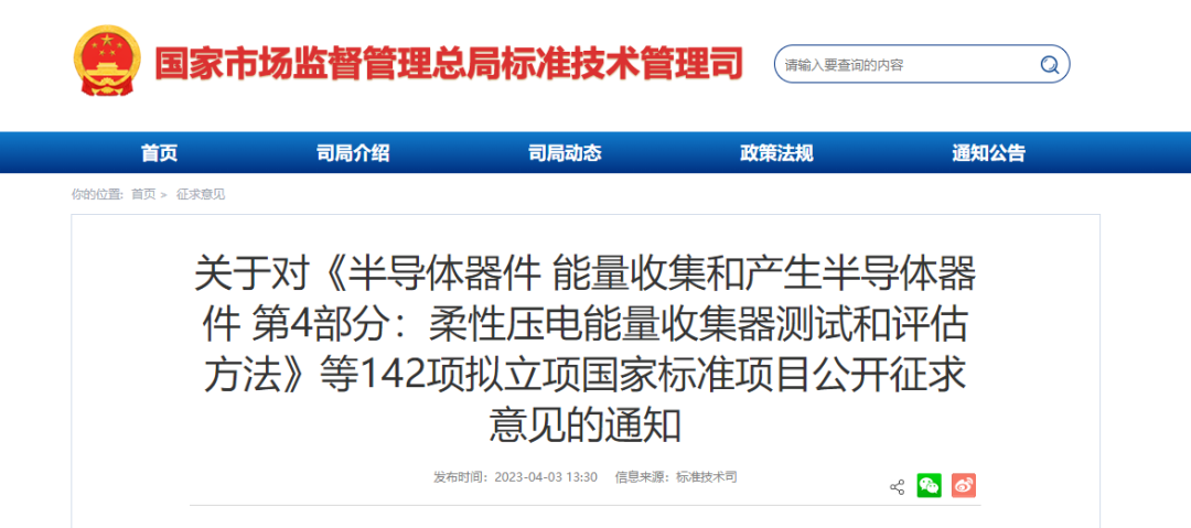 4月3日,國家標(biāo)準(zhǔn)化管理委員會(huì)對《半導(dǎo)體器件 能量收集和產(chǎn)生半導(dǎo)體器件 第4部分:柔性壓電能量收集器測試和評(píng)估方法》等142項(xiàng)擬立項(xiàng)國家標(biāo)準(zhǔn)項(xiàng)目公開征求意見,其中,包括《家用直接作用式房間電加熱器 性能測試方法 第2部分:輻射系數(shù)測量的附加規(guī)定》《家用直接作用式房間電加熱器 性能測試方法 第3部分:輻射效率測量的附加規(guī)定》2項(xiàng)輕工領(lǐng)域擬立項(xiàng)國家標(biāo)準(zhǔn)項(xiàng)目,截止時(shí)間為2023年5月2日。
