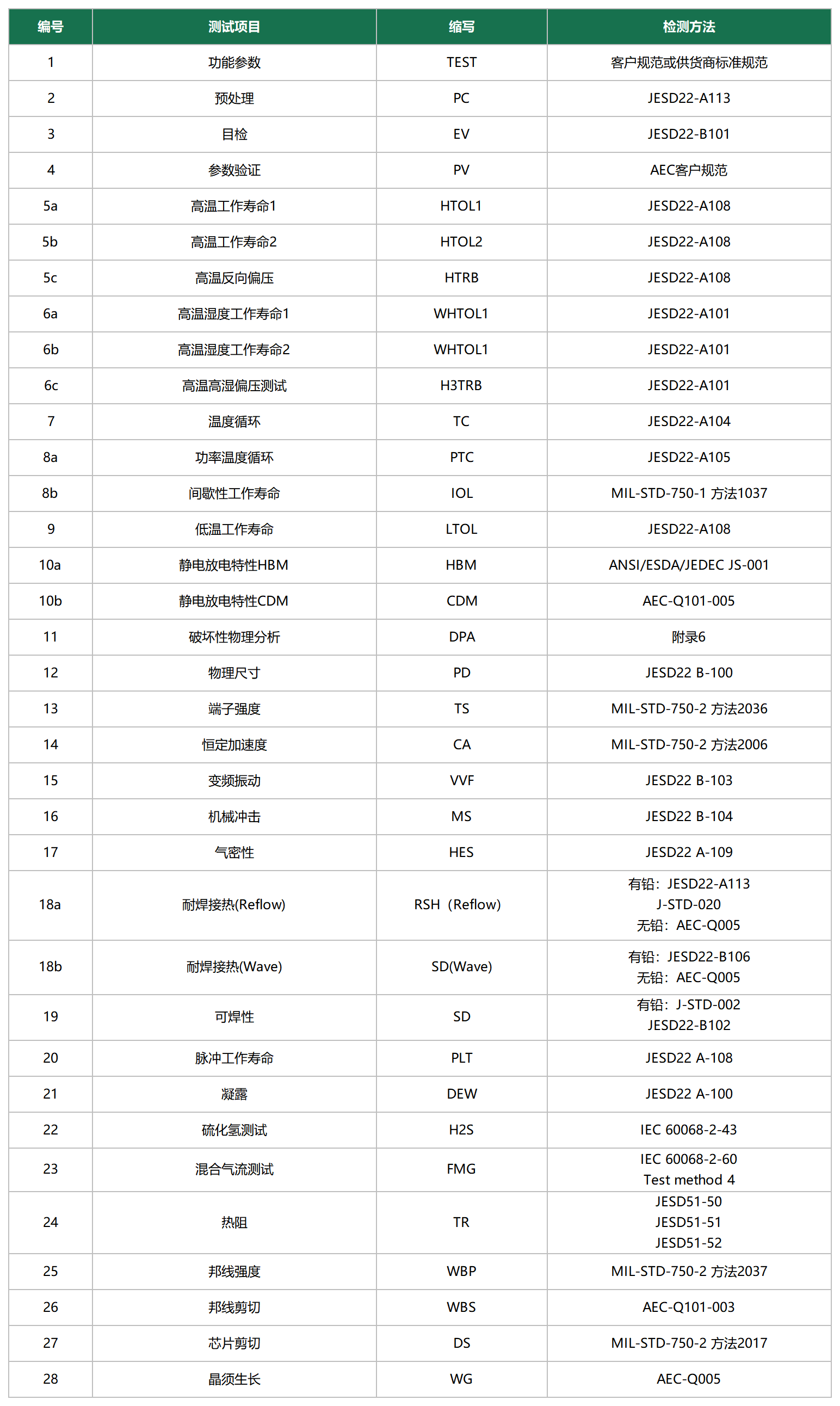提供電子元器件的檢測提供整套測試儀器,可以為各類電子、電器制造廠商提供一下檢驗測試項目的專業儀器設備:集成電路測試:成品測試、老化篩選、失效分析等;破壞性物理分析:外部目檢、X射線檢查、粒子噪聲(PIND)試驗、密封性試驗、內部氣體成分分析、內部目檢、內引線鍵合強度、掃描電鏡、芯片剪切強度;可靠性壽命和老化篩選:老化篩選試驗、穩態壽命試驗、加速壽命試驗、可靠性強化試驗;環境試驗:正弦振動、隨機振動、機械沖擊、碰撞(或連續沖擊)、恒定加速度、跌落、出點動態監測、溫度-振動-濕熱三應力試驗、高低溫低氣壓、溫度循環、熱沖擊、耐濕、高壓蒸煮、鹽霧或循環鹽霧、霉菌、淋雨、氣體腐蝕、沙塵、熱真空、強加速穩態濕熱(HAST);物理性試驗:物理尺寸、耐溶劑性、引出端強度、可焊性、耐焊接熱、封蓋扭矩、鍍層厚度、阻燃性試驗。