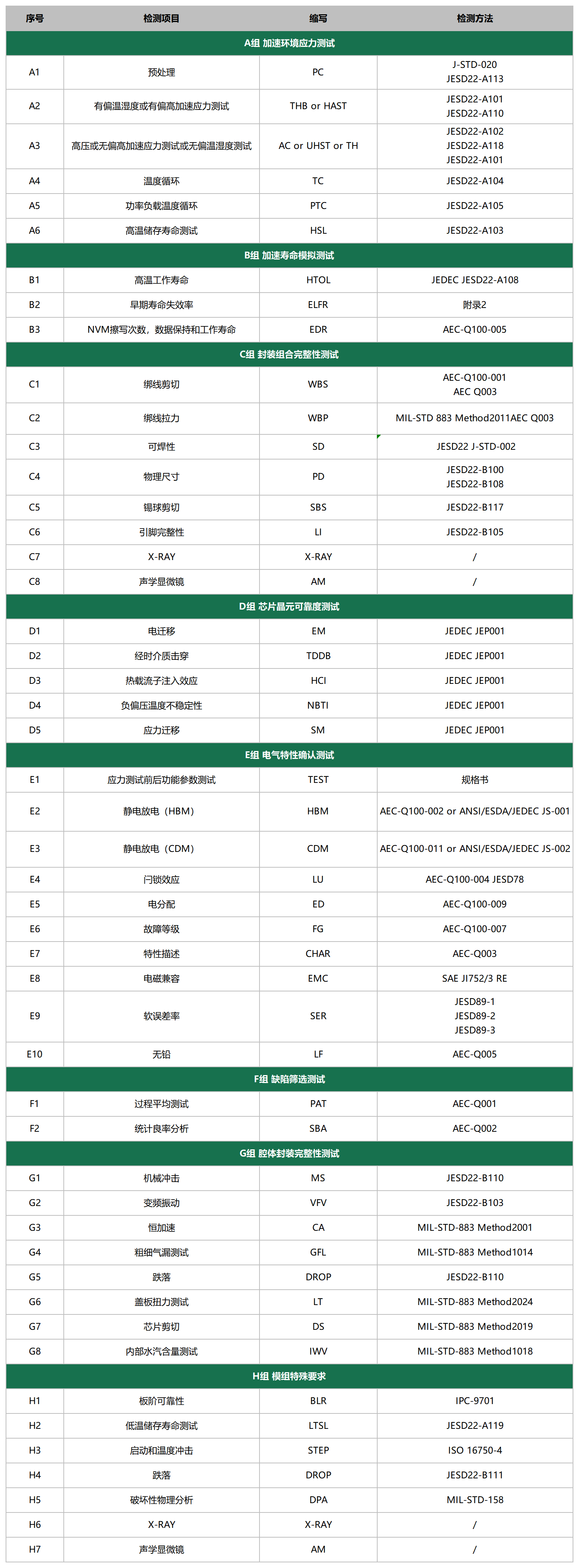 提供電子元器件的檢測(cè)提供整套測(cè)試儀器,可以為各類電子、電器制造廠商提供一下檢驗(yàn)測(cè)試項(xiàng)目的專業(yè)儀器設(shè)備:集成電路測(cè)試:成品測(cè)試、老化篩選、失效分析等;破壞性物理分析:外部目檢、X射線檢查、粒子噪聲(PIND)試驗(yàn)、密封性試驗(yàn)、內(nèi)部氣體成分分析、內(nèi)部目檢、內(nèi)引線鍵合強(qiáng)度、掃描電鏡、芯片剪切強(qiáng)度;可靠性壽命和老化篩選:老化篩選試驗(yàn)、穩(wěn)態(tài)壽命試驗(yàn)、加速壽命試驗(yàn)、可靠性強(qiáng)化試驗(yàn);環(huán)境試驗(yàn):正弦振動(dòng)、隨機(jī)振動(dòng)、機(jī)械沖擊、碰撞(或連續(xù)沖擊)、恒定加速度、跌落、出點(diǎn)動(dòng)態(tài)監(jiān)測(cè)、溫度-振動(dòng)-濕熱三應(yīng)力試驗(yàn)、高低溫低氣壓、溫度循環(huán)、熱沖擊、耐濕、高壓蒸煮、鹽霧或循環(huán)鹽霧、霉菌、淋雨、氣體腐蝕、沙塵、熱真空、強(qiáng)加速穩(wěn)態(tài)濕熱(HAST);物理性試驗(yàn):物理尺寸、耐溶劑性、引出端強(qiáng)度、可焊性、耐焊接熱、封蓋扭矩、鍍層厚度、阻燃性試驗(yàn)。