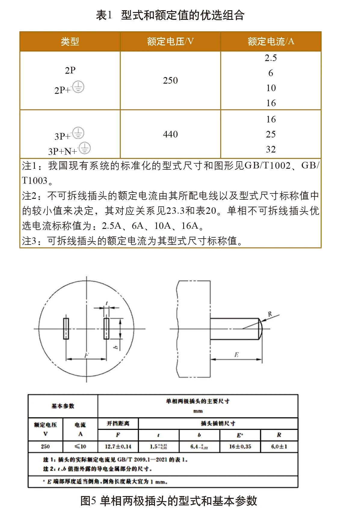 對(duì)單相插頭而言,其型式尺寸標(biāo)稱值仍為10A和16A,但實(shí)際電流值改為了≤10A,并明確實(shí)際電流值見新版GB/T 2099.1的表1,單相兩極插頭的型式和基本參數(shù)如圖5所示。