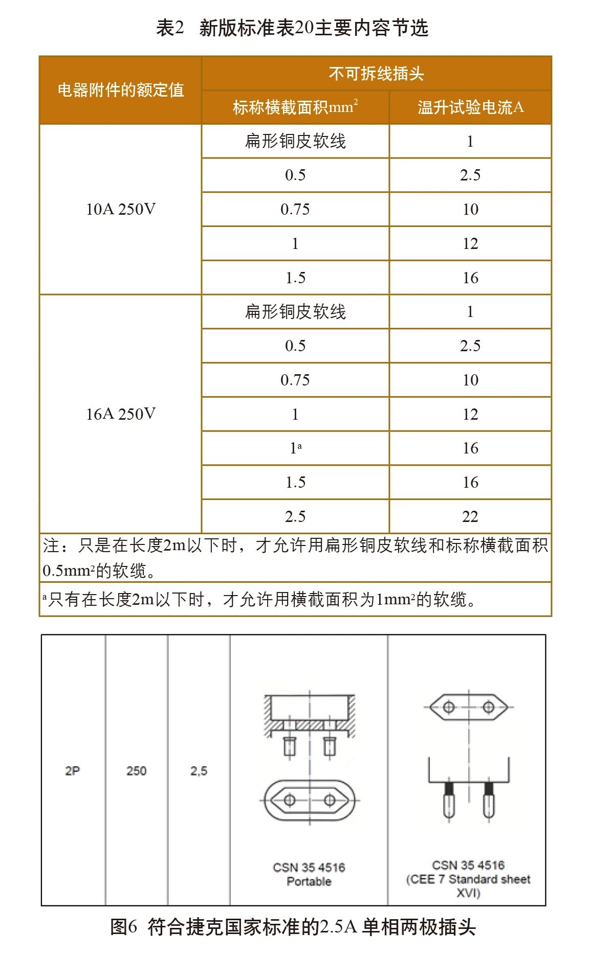 另外,對(duì)于配接雙芯銅皮軟線(60227IEC41)的不可拆線插頭,表20給出的溫升試驗(yàn)電流為1A,同理,它的額定電流值即為1A。