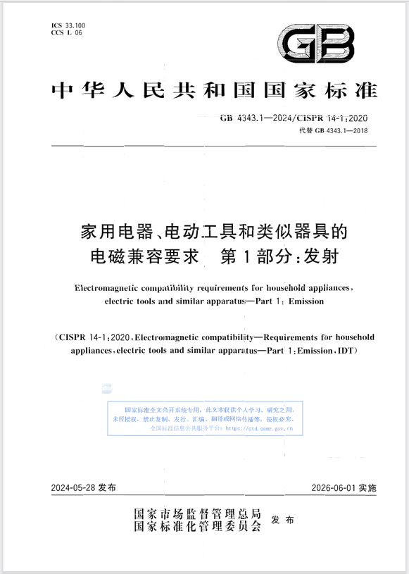 根據(jù)國家市場監(jiān)督管理總局(國家標準化管理委員會)2024年第10號國家標準公告,GB 4343.1-2024《家用電器、電動工具和類似器具的電磁兼容要求 第1部分:發(fā)射》已批準發(fā)布,新標準將于2026年6月1日正式實施,替代GB 4343.1-2018《家用電器、電動工具和類似器具的電磁兼容要求 第1部分:發(fā)射》。