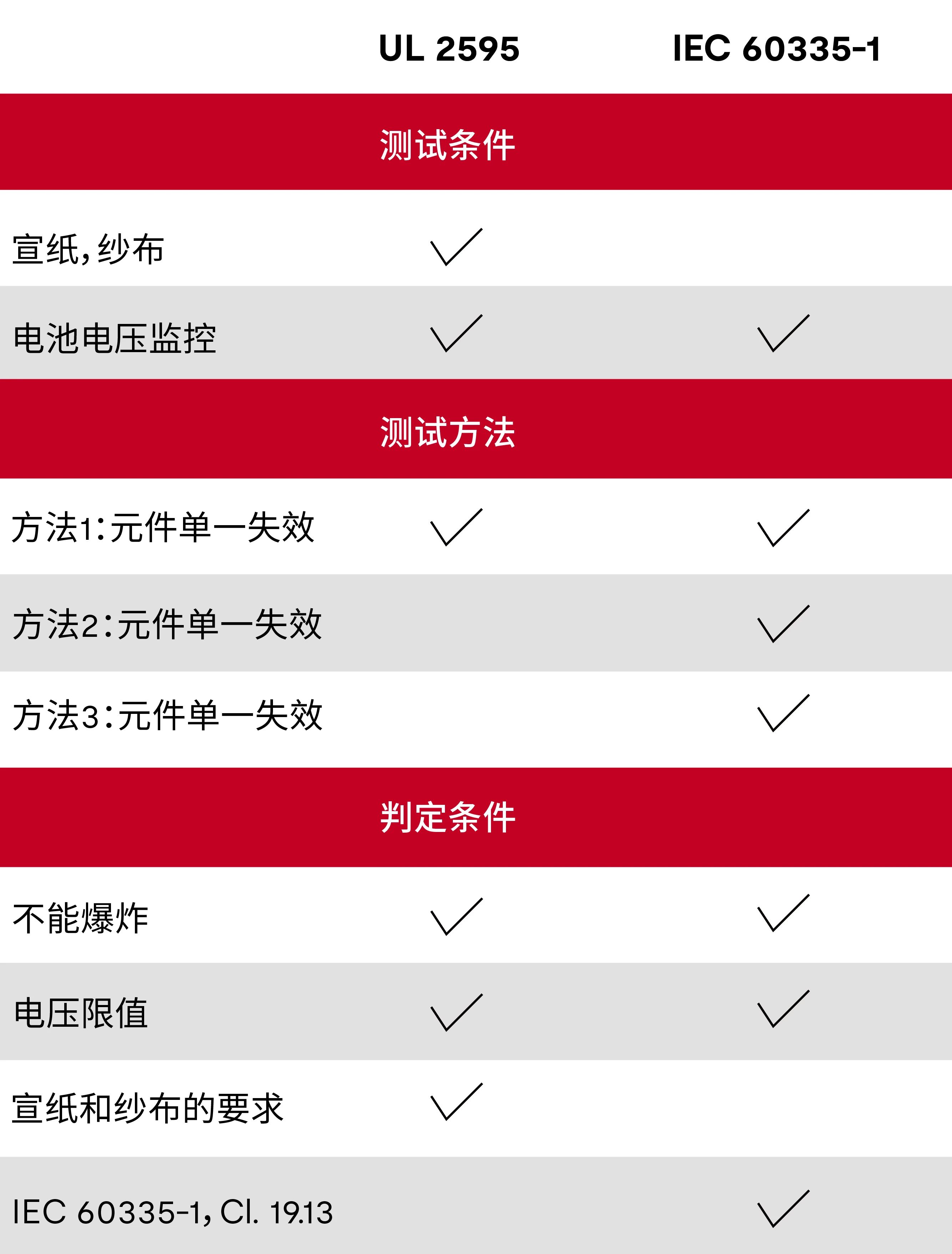 最后我們來總結一下,針對非正常充電測試,UL 2595和IEC 60335-1:2020中的方法大致相同,但在細節上有所差異,如下表所示。