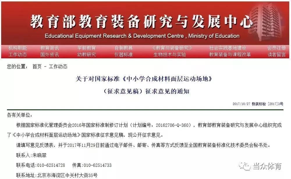 10月26日,教育部教育裝備研究與發(fā)展中心網(wǎng)站發(fā)布“關(guān)于對國家標(biāo)準(zhǔn)《中小學(xué)合成材料面層運(yùn)動(dòng)場地》(征求意見稿)征求意見的通知”。目前,教育部教育裝備研究與發(fā)展中心已組織完成了意見稿,現(xiàn)公開征求意見。截止日期11月29日。
