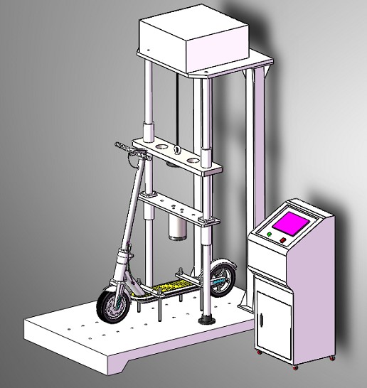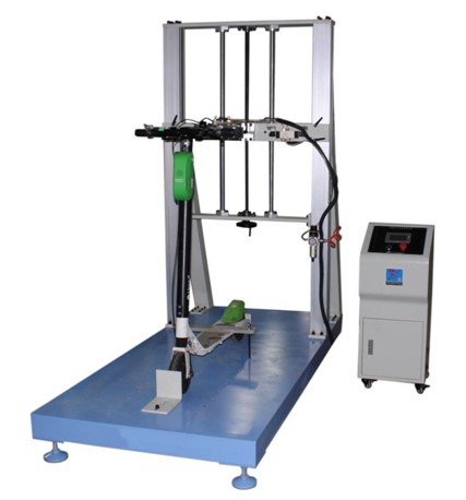 跌落沖擊試驗機 本機試法系以規定重量之砝碼,調整在一定的高度,使之自由落下沖擊滑板車或滑板,視其受損程度,來判斷品質。